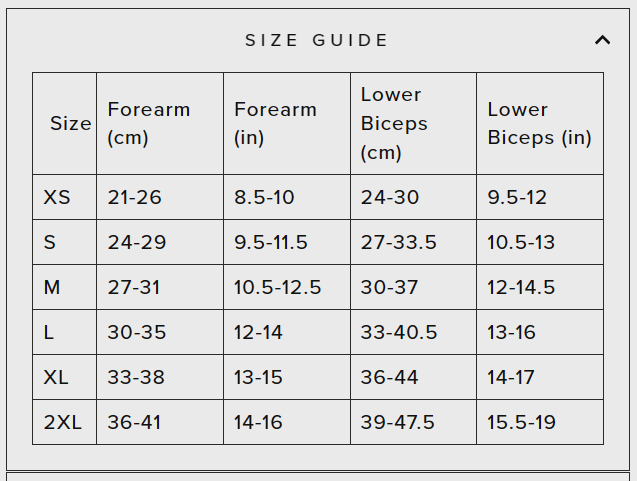 Measure the circumference of your forearm and lower biceps, taken with your arm locked and muscles relaxed, then choose a size that best fits both measurements.